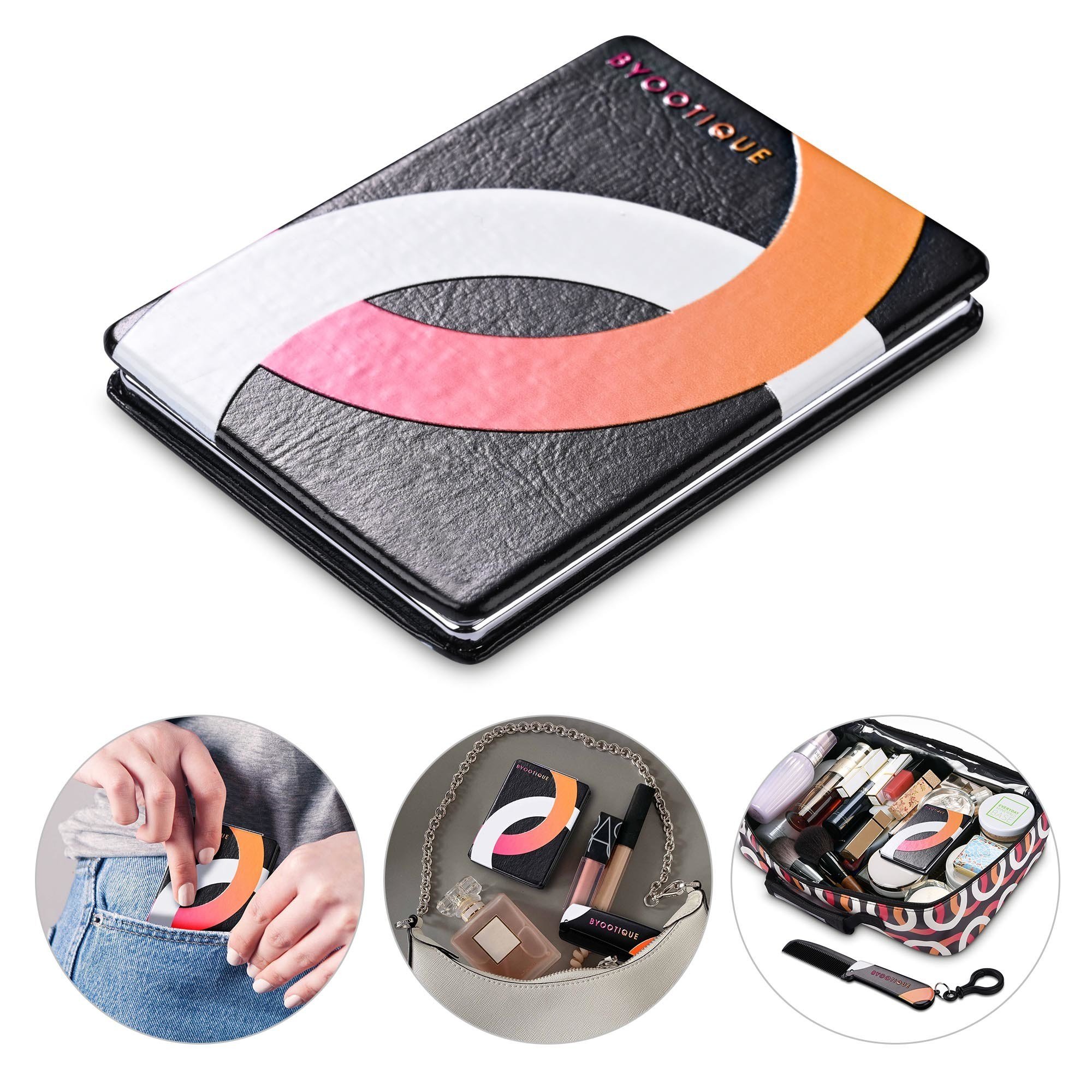 - Portable Makeup Set - Byootique Pocket Mirror with Comb features foldable small design for easy putting in handbag; cosmetic bag or pocket; Separated mirror & comb allow you to better view & fix your makeup and hair in time; Suitable for women; girls and makeup-artists for daily use; outgoing; traveling; working; going to parties; etc