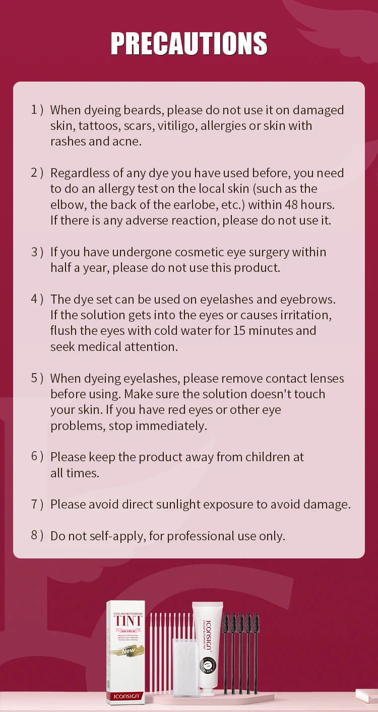(4) The dye set can be used on eyelashes and eyebrows.If the solution gets into the eyes or causes irritation,flush the eyes with cold water for 15 minutes and seek medical attention.